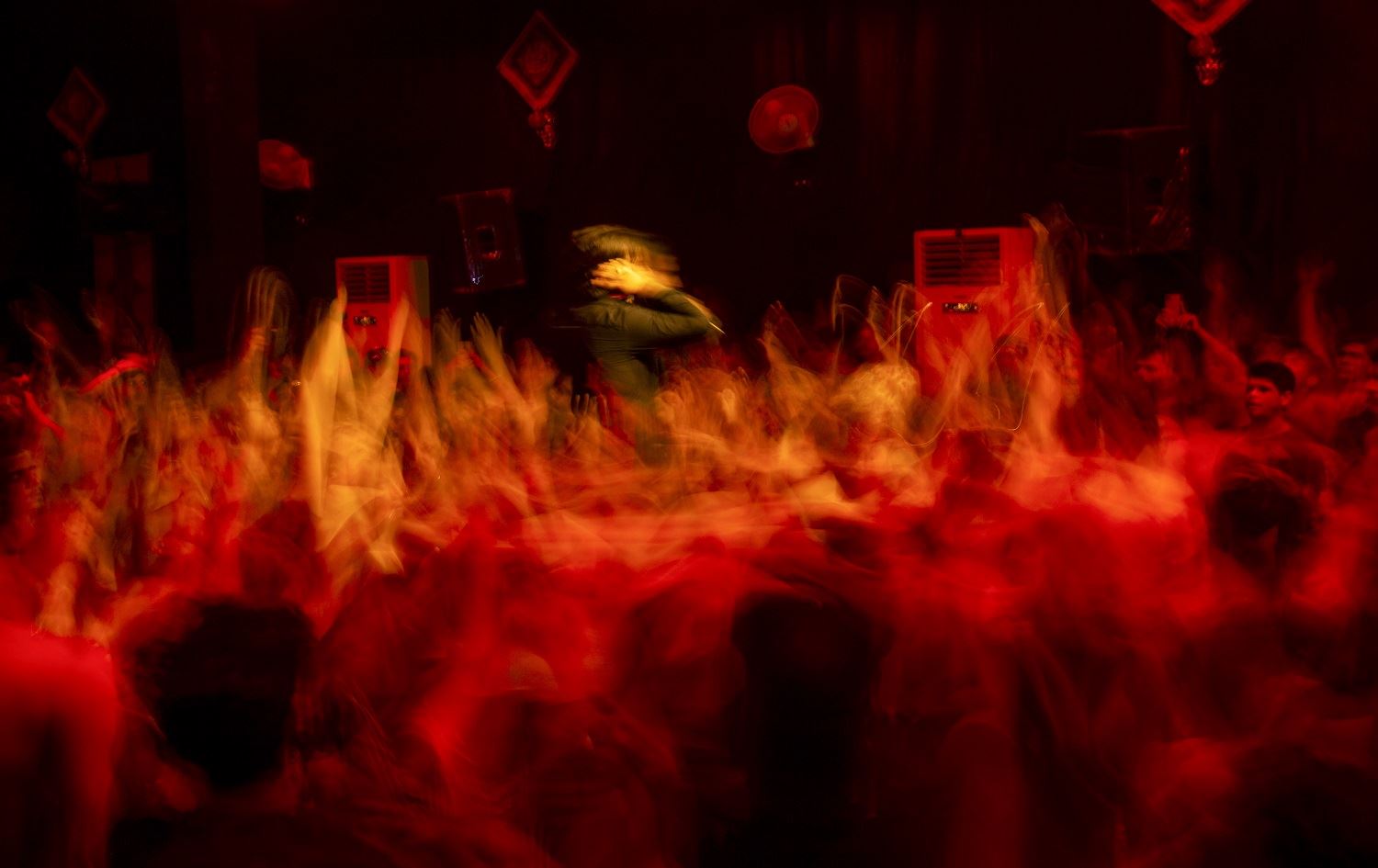 The mourners stand in a cluster facing the bright neon lights of the main shrine and chant rhyming mourning chants customary during this month - with a twist.