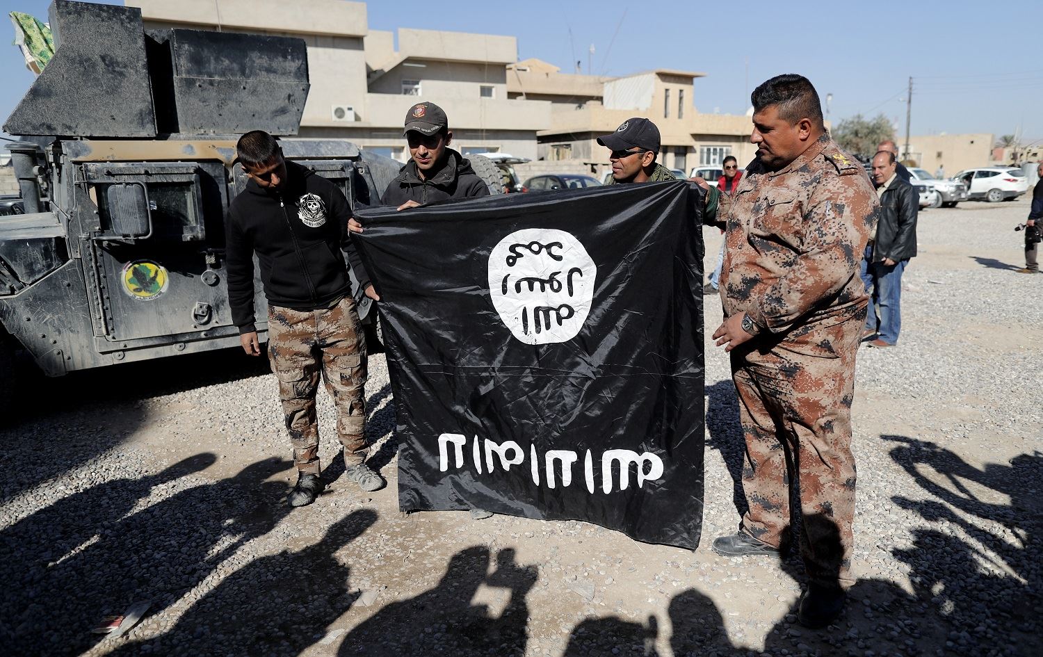 Iraqi soldiers pose with an upside-down Islamic State (ISIS) on the outskirts of Mosul on November 23, 2016. File photo: Thomas Coex/AFP