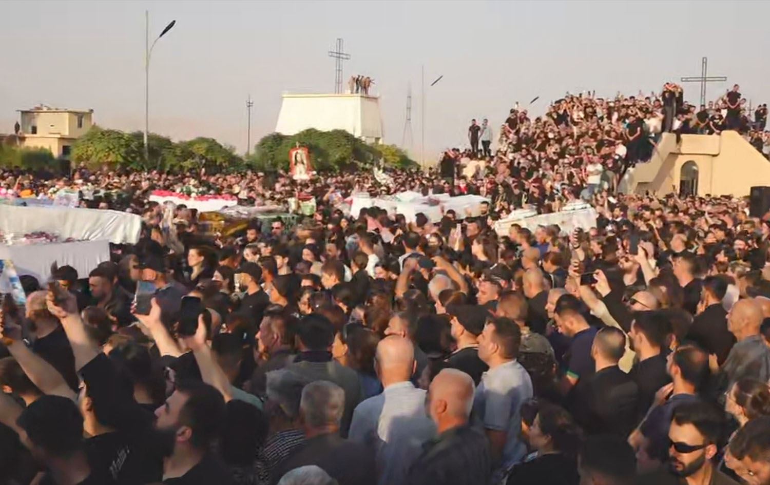 Mourners attend the funeral of victims who were killed when a fire ripped through a crowded wedding hall in the Assyrian Christian northern district of Hamdaniya on September 27, 2023. Photo: Rudaw