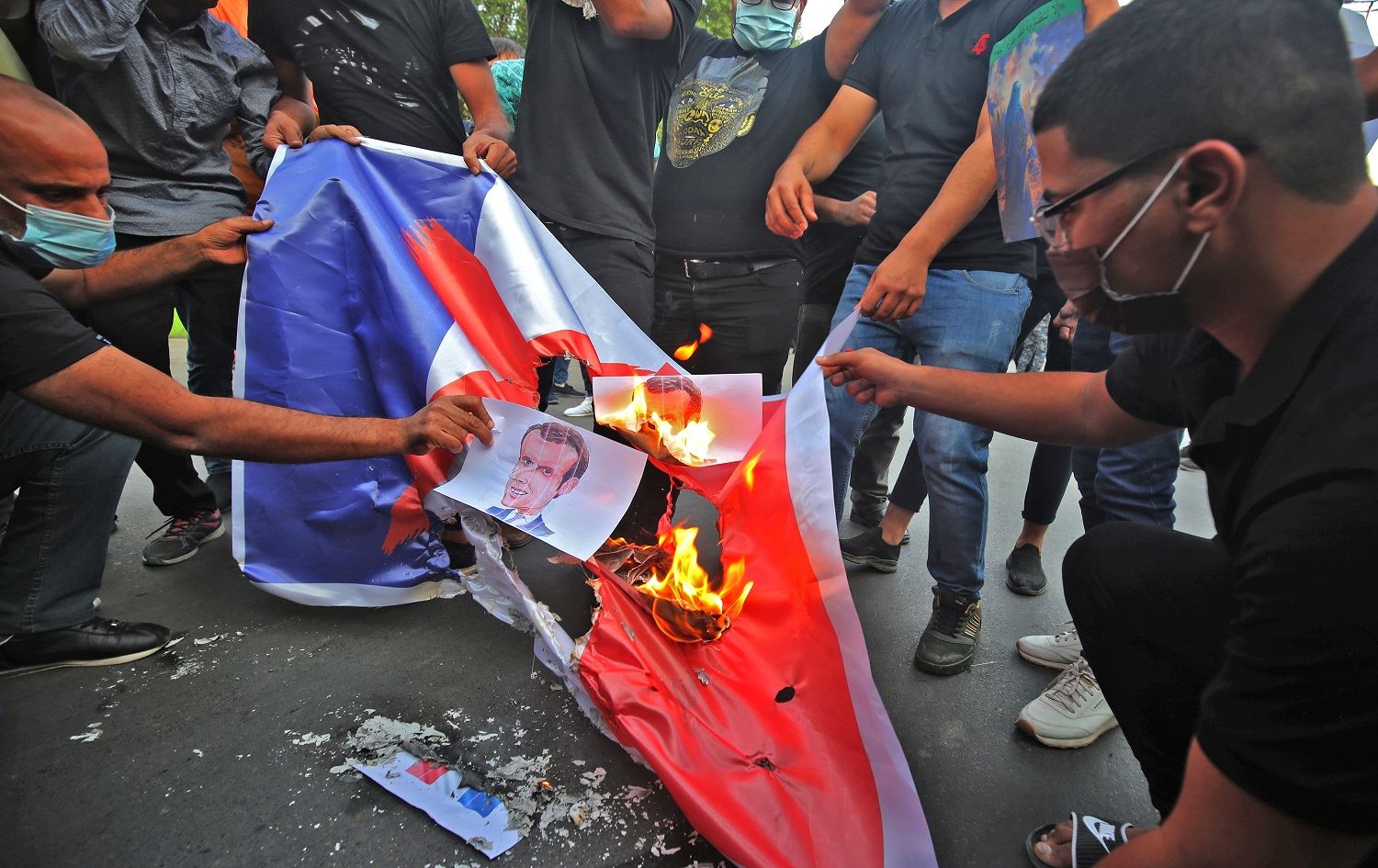 Iraqi protestors burn posters and the French flag during a demonstration against French President Emmanuel Macron in front of the French embassy in Baghdad on October 26, 2020. Photo: Ahmad al Rubaye/AFP