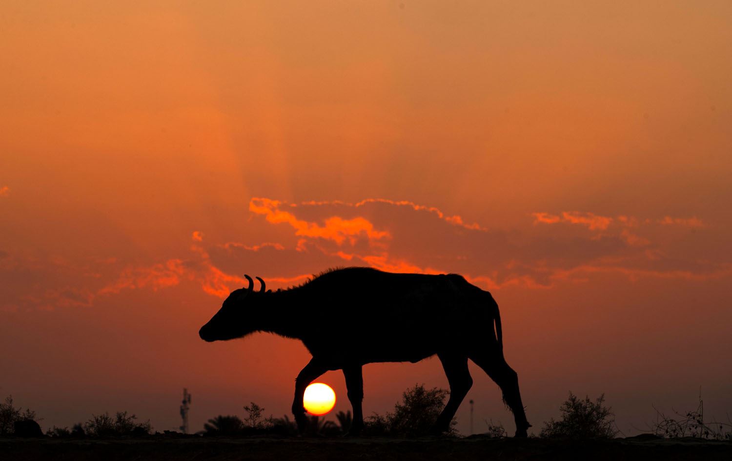 A buffalo is pictured at sunset on the banks of the Shat al-Arab river in the southern city of Basra, 550kms south of Baghdad, on November 26, 2022. Photo: Hussein Faleh/AFP
