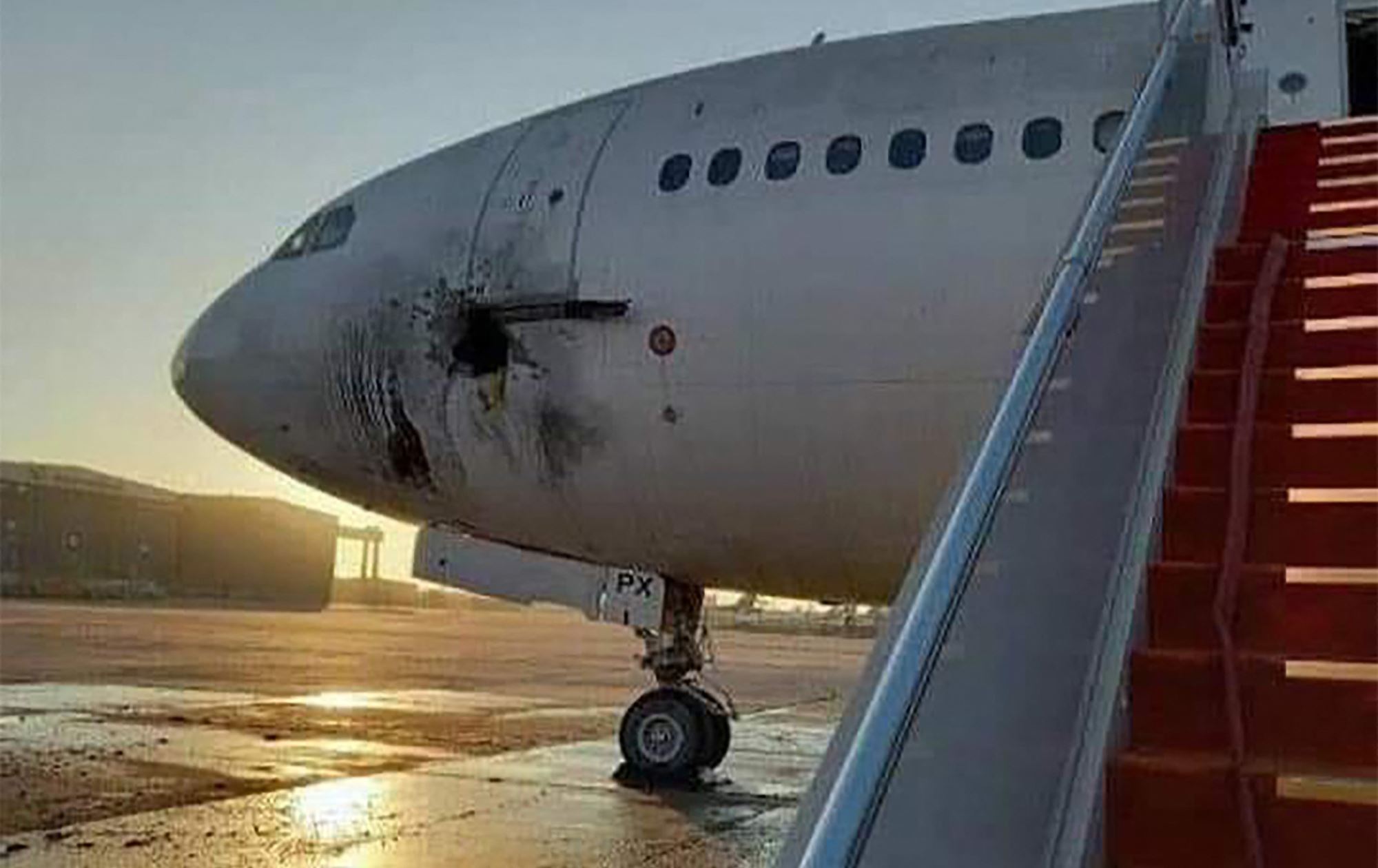 A handout picture shows a damaged stationary aircraft on the tarmac of Baghdad airport, after rockets reportedly tragetted the runway, on January 28. Photo: Facebook page of Iraqi Ministry of Transportation
