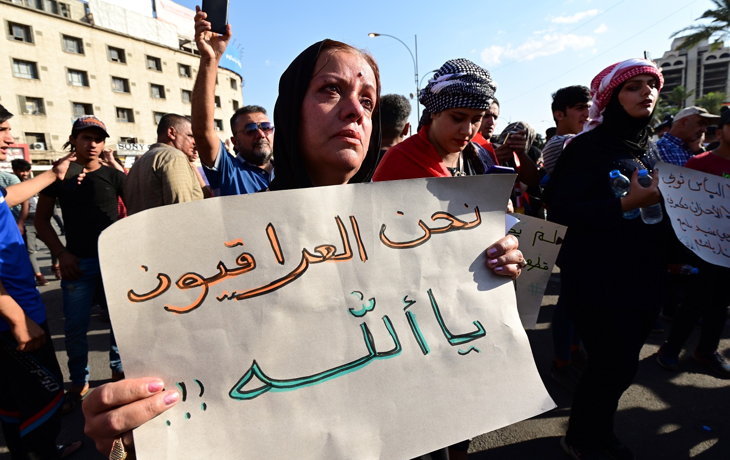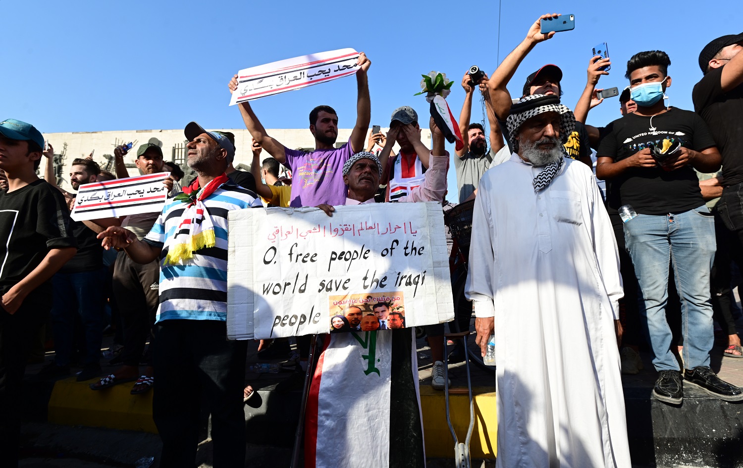 By 3 o’clock in the afternoon, their numbers began to swell. Demonstrators raised Iraqi flags and the mood was upbeat. A small truck laden with loudspeakers blaring patriotic songs drove slowly around Tahrir Square. Young men stood on the truck, waving the Iraqi flag and leading a chant: "We will not abandon Iraq."