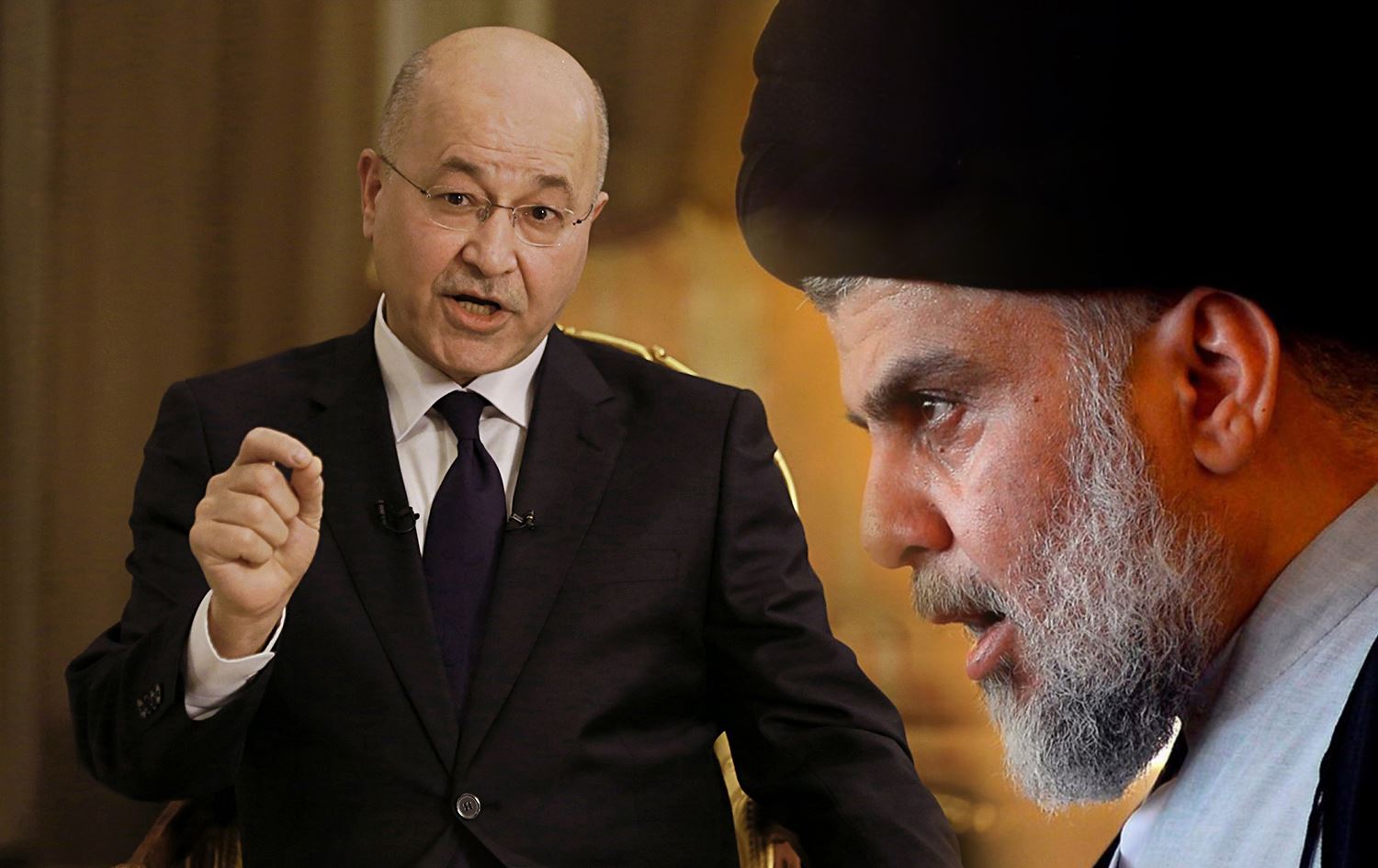 Iraqi President Barham Salih (left) on March 29, 2019. Photo: AP; Muqtada al-Sadr (right). Photo: AFP; Graphic: Rudaw