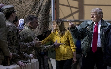On the ground for only about three hours, the American president told the men and women with the U.S. military that Islamic State forces have been vanquished, and he defended his decision against all advice to withdraw U.S. troops from neighboring Syria, He said the U.S. was once again respected as a nation, and declared: “We’re no longer the suckers, folks.”