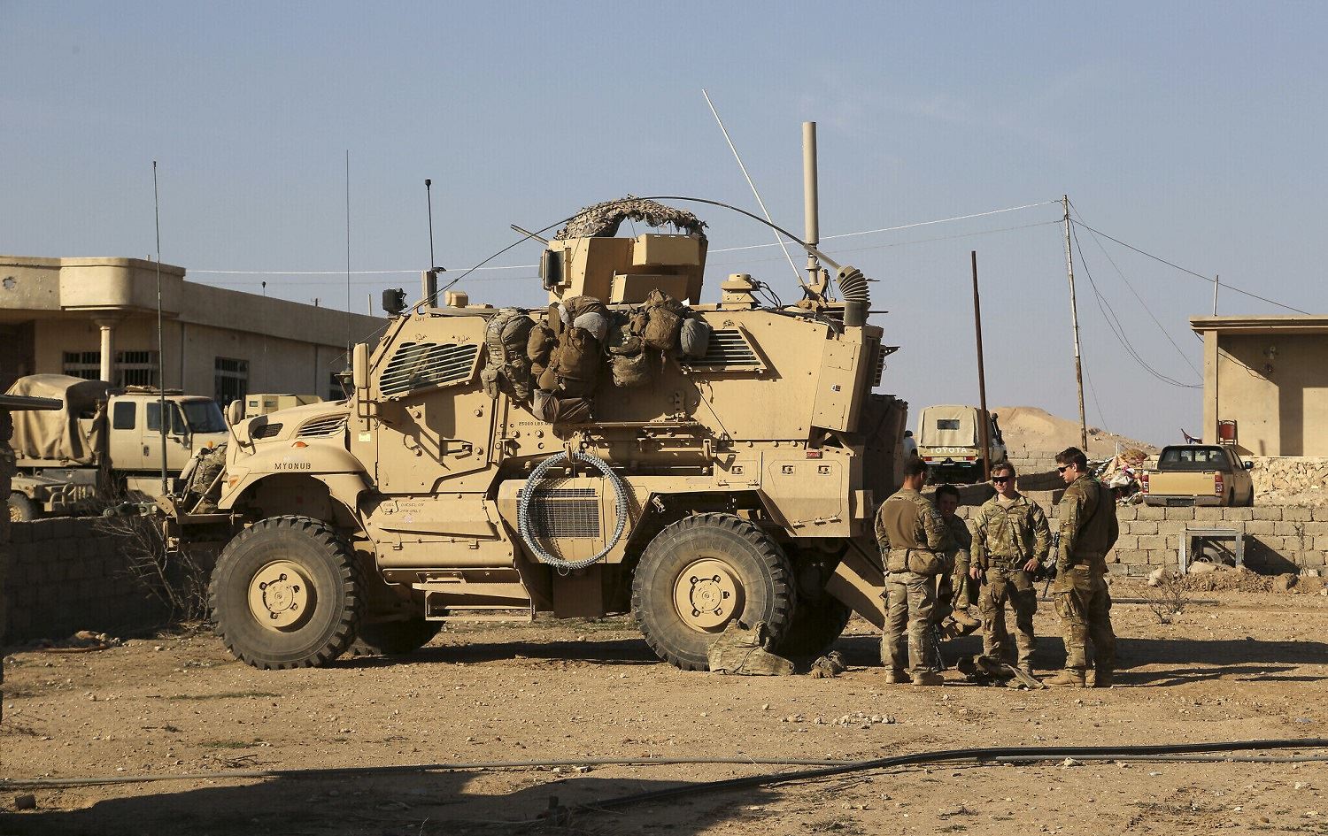 US Army soldiers stand outside their armored vehicle on a joint base with Iraqi army south of Mosul, Iraq on February 23 2017.Photo: Khalid Mohammed/AP