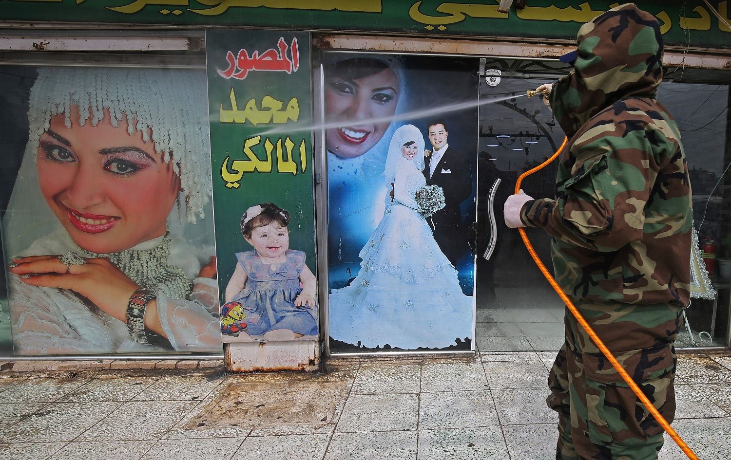 A member of the Iraqi Civil Defence disinfects a street in Baghdad's eastern Sadr City suburb on March 28, 2020. Photo: Ahmad Al-Rubaye