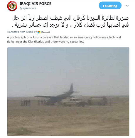 "The defense ministry announced that a 'Cessna Caravan' plane had an emergency landing during a training flight due to technical issues in Mudiyah area in Kalar district without any casualties," tweeted Brig. Gen. Rasoul.