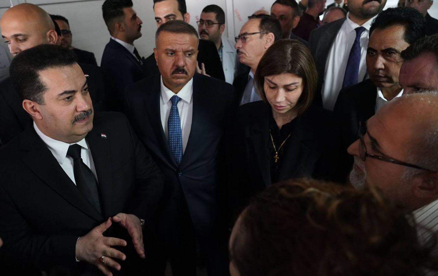 From left, Iraqi Prime Minister Mohammed Shia' al-Sudani, Interior Minister Abdul-Amir al-Shammari, Migration and Displacement Minister Evan Faeq Gabro speaking with the families of the Hamdaniya fire victims in Nineveh province, on September 28, 2023. Photo: PM Sudani's office