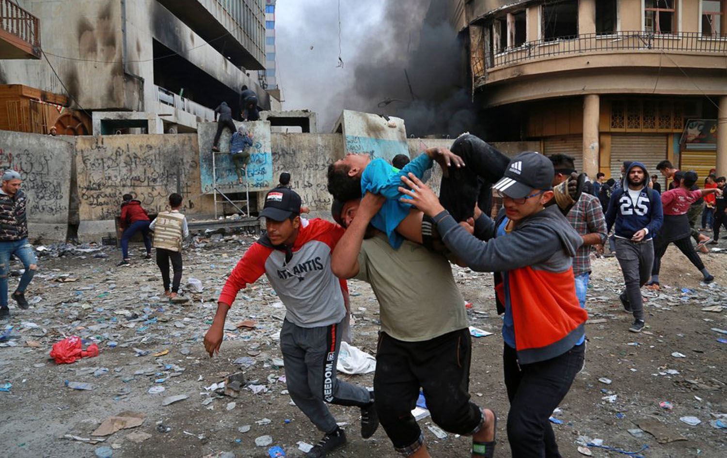 A wounded protester is carried to receive first aid during clashes with security forces on Rasheed Street in Baghdad, Iraq, November 28, 2019. Photo: Khalid Mohammed / AP