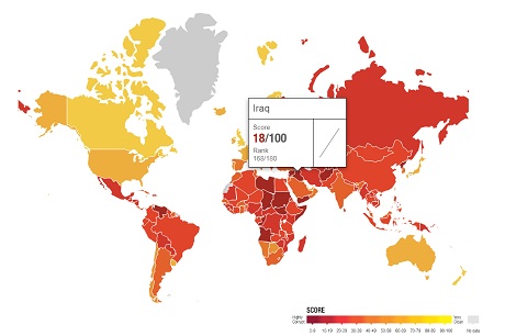 On the 2018 corruption perception index by transparency international, Iraq ranked 168 of 180, a score of 18 out of a 100, thus ranking as one of the most corrupt countries around the world.