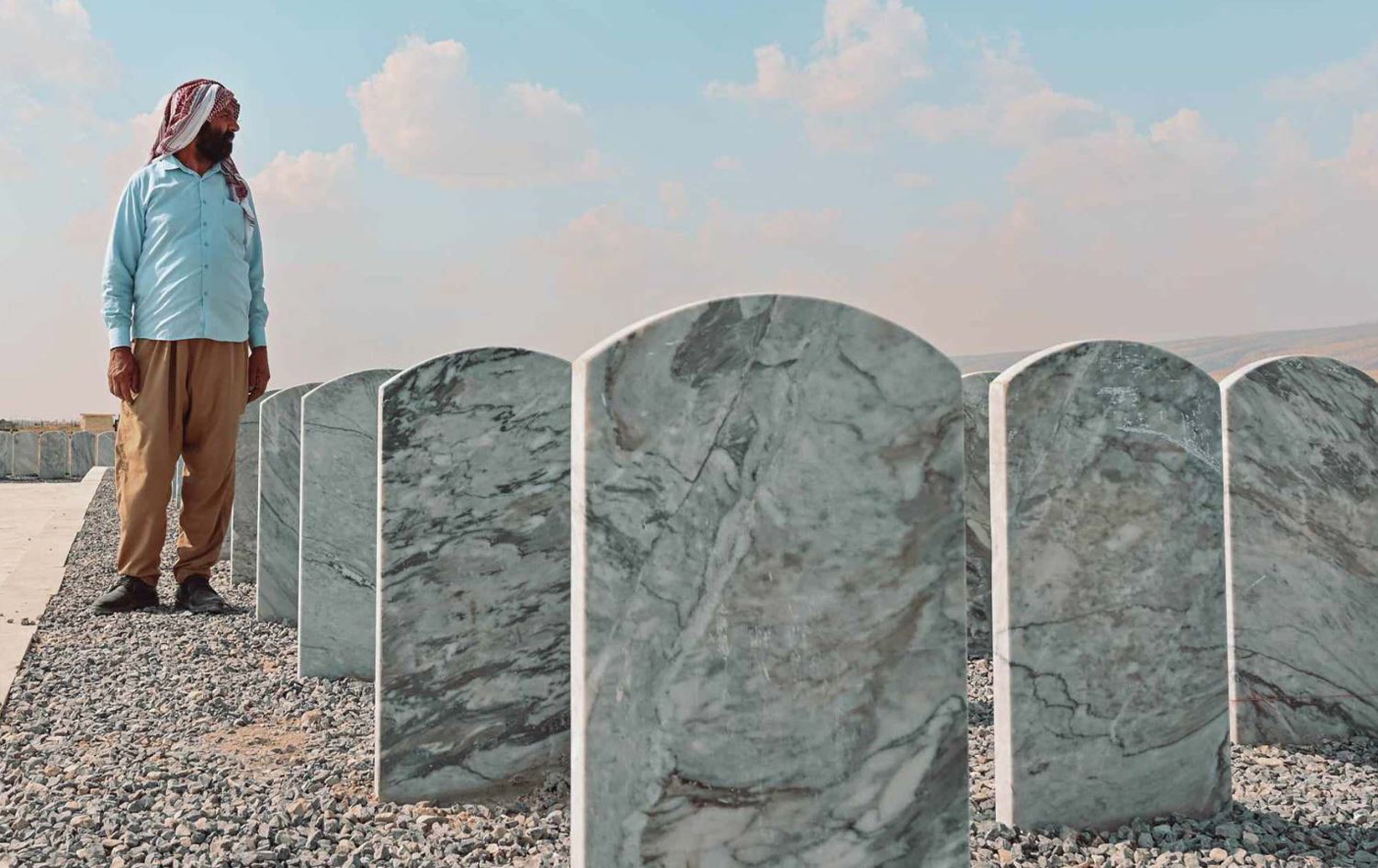 A Yazidi man stands near the unmarked headstones honoring the victims of the 2014 genocide. Date: October 18, 2023. Photo: Bilind T. Abdullah/Rudaw