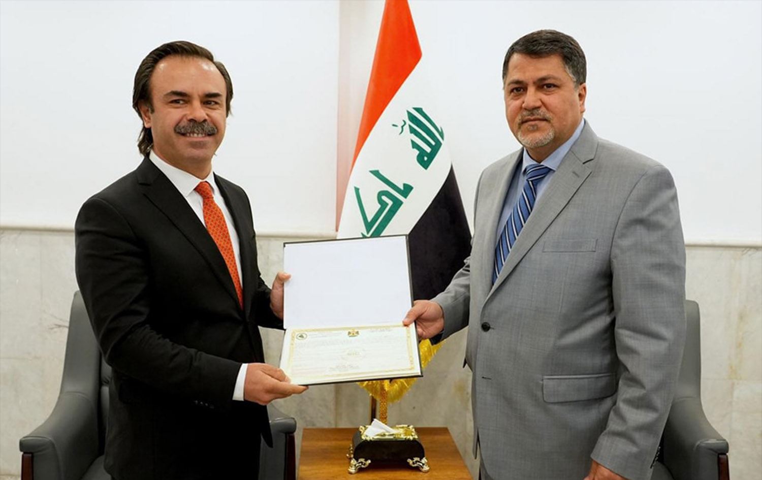 Iraqi and French TotalEnergies officials signing an investment license to develop solar power on June 30, 2024. Photo: Iraqi National Investment Commission/Facebook