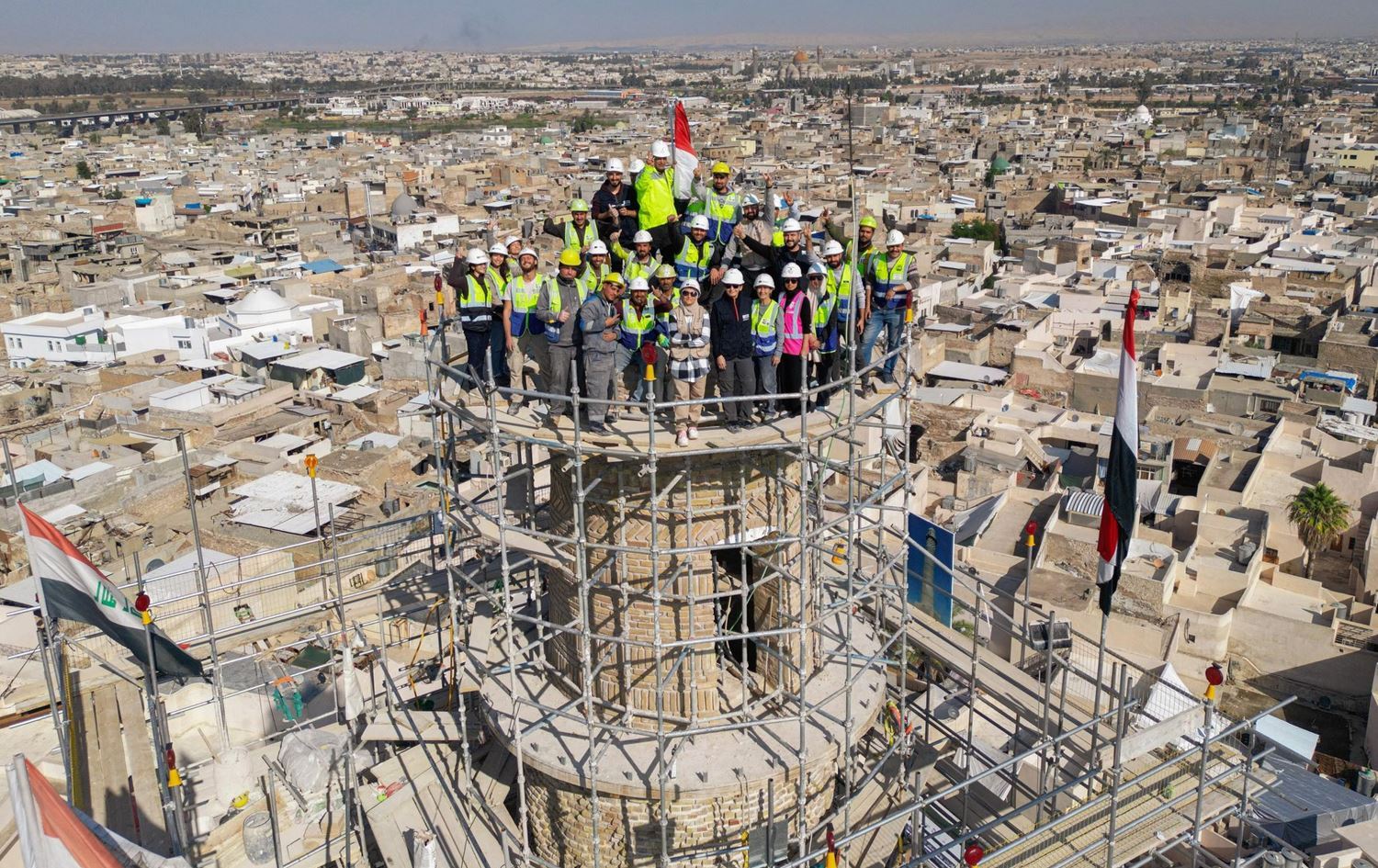 A UNESCO reconstruction team stands atop scaffolding around Mosul’s al-Hadba minaret. Photo: UNESCO/Abdullah Rashid.