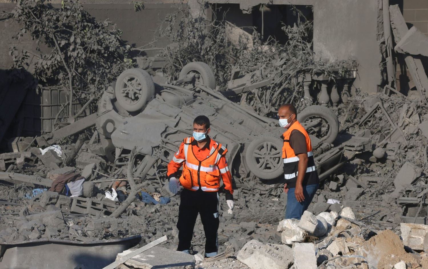 Palestinian rescuers stand on the rubble of a building following an Israeli airstrike in Rafah, in the southern Gaza Strip, on October 16, 2023. Photo: AFP
