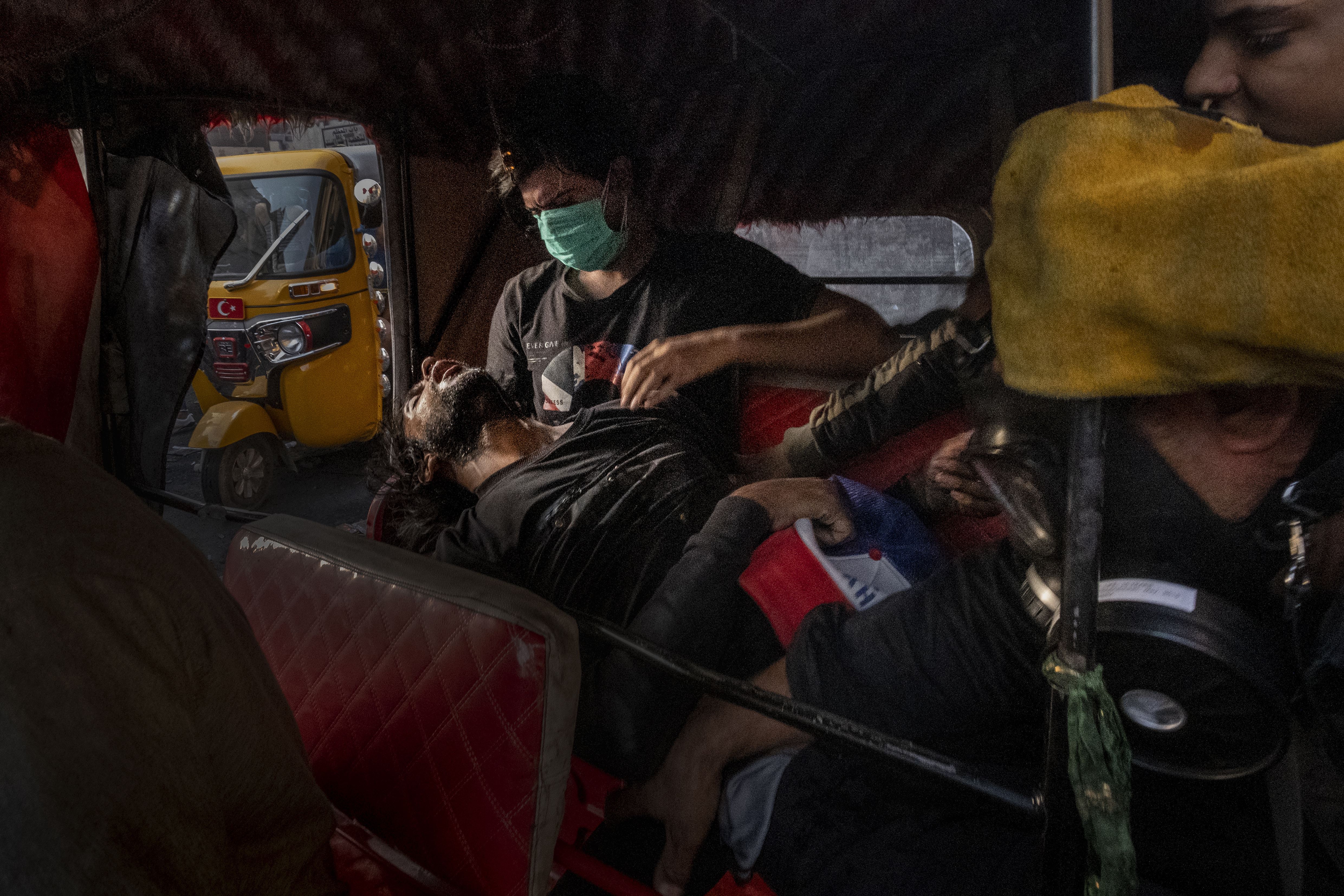 A man assists a fellow protester, who became unconscious after government forces fired tear gas and smoke grenades during a protest in Baghdad, Iraq, on Nov. 15, 2019. Photo: Ricardo Garcia Vilanova/World Press Photo via AP