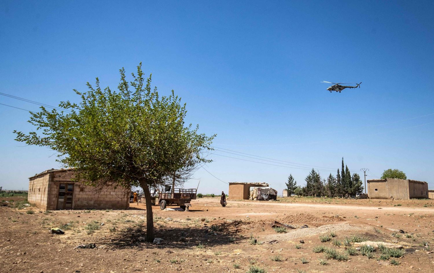 A military helicopter hovers above houses in the al-Darbasiyah town in northeastern Hasaka province on July 14, 2021. Photo: Delil Souleiman/AFP