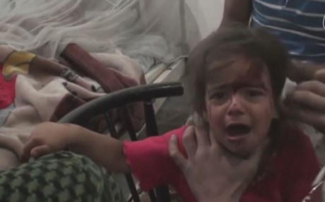 The video shows the apparent bomb strike aftermath, followed by graphic footage of dead and injured children being treated and prepared for burial.