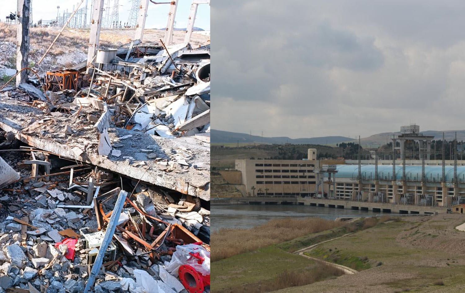 Damage caused to Tishreen Dam in northern Syria in April 2025 (left) and a file photo of the dam. Photo and graphic: Rudaw