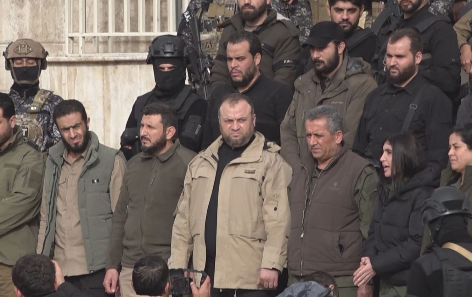 Marwan al-Ali, newly-appointed head of Syrian internal security in Hasaka (center), posing alongside his deputy - Siamand Afrin, a senior commander of Kurdish internal security forces (third from right) - to take photos after entering Hasaka city, Syria, on February 2, 2025. Photo: Screengrab / Rudaw