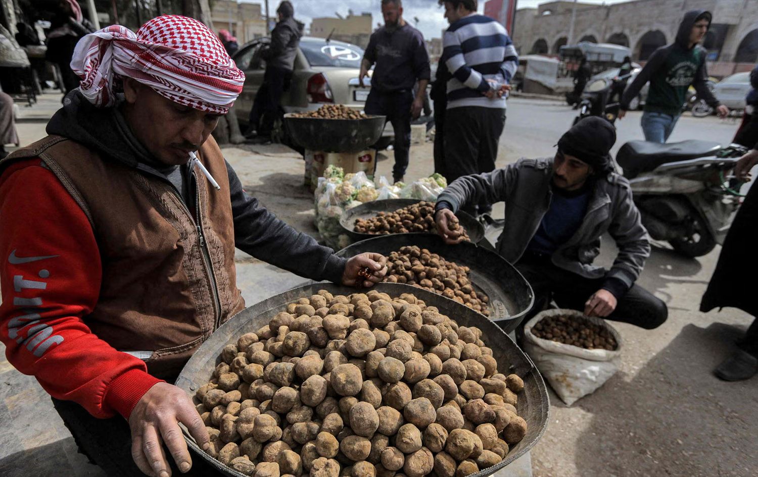 A merchant sorts through desert truffles at a stall in a market in the city of Hama in west-central Syria on March 6, 2023. Photo: Louai Beshara/AFP