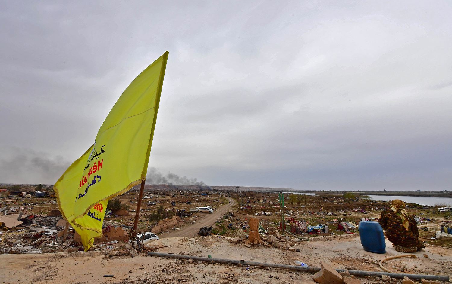 A member of the Syrian Democratic Forces (SDF) sits next to a barrel atop a roof with the SDF's unfurled flag at a position in the village of Baghouz in Syria's eastern Deir ez-Zor province near the Iraqi border on March 24, 2019. Photo: Giuseppe Cacace/AFP