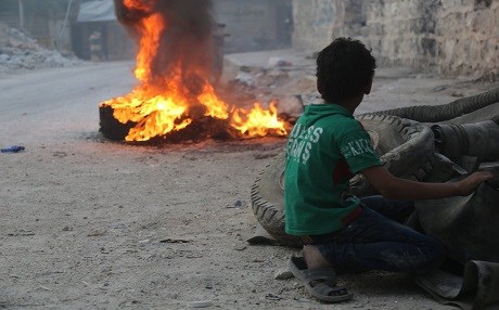 Children set fire to tires to create a smokescreen in order to prevent Syrian and Russian airstrikes on the rebel positions, for which a resident of Aleppo apologized.
