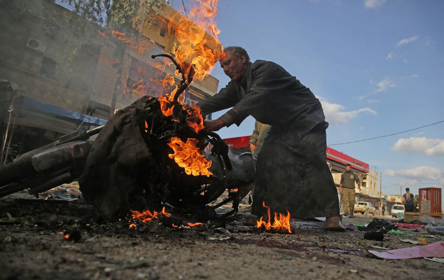 A Syrian man stands next to a burning motorcycle at the site of a car bomb explosion in the northern Syrian Kurdish town of Tal Abyad, on the border with Turkey, on November 2, 2019.Photo: Bakr Alkasem/AFP