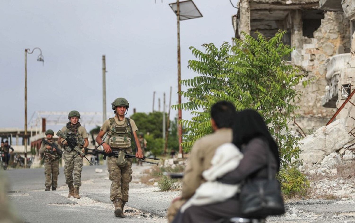 Turkish soldiers patrol past destroyed buildings atop the Arbaeen hill overlooking Ariha, Idlib province on May 26, 2020. Photo: Omar Haj Kadour / AFP