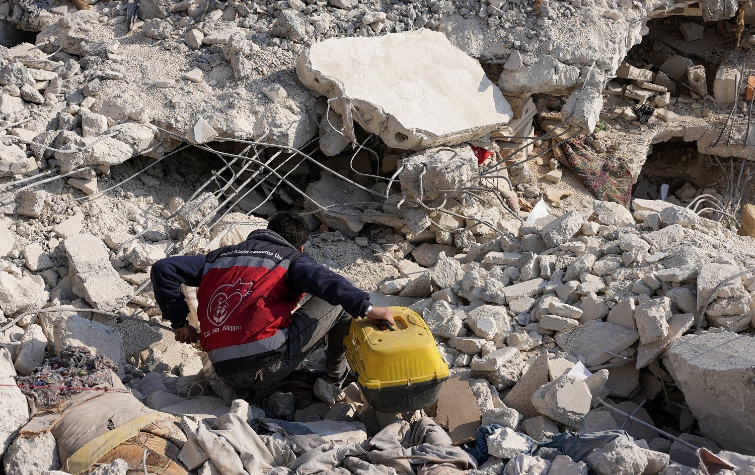 In this picture taken on February 24, 2023, a volunteer searches for animals in the rubble of an earthquake-devasted building in Jindiris, in the rebel-held Syrian province of Aleppo. Photo: Rami al-Sayed/AFP