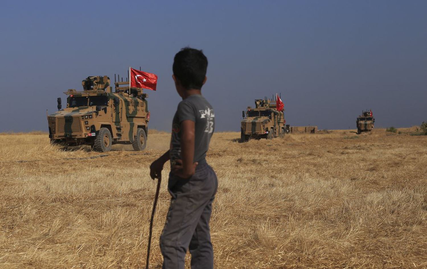 A Syrian boy watches Turkish armoured vehicles conducting a joint ground patrol with American forces near Tal Abyad, northeastern Syria on October 4, 2019. Photo: Baderkhan Ahmad/AP