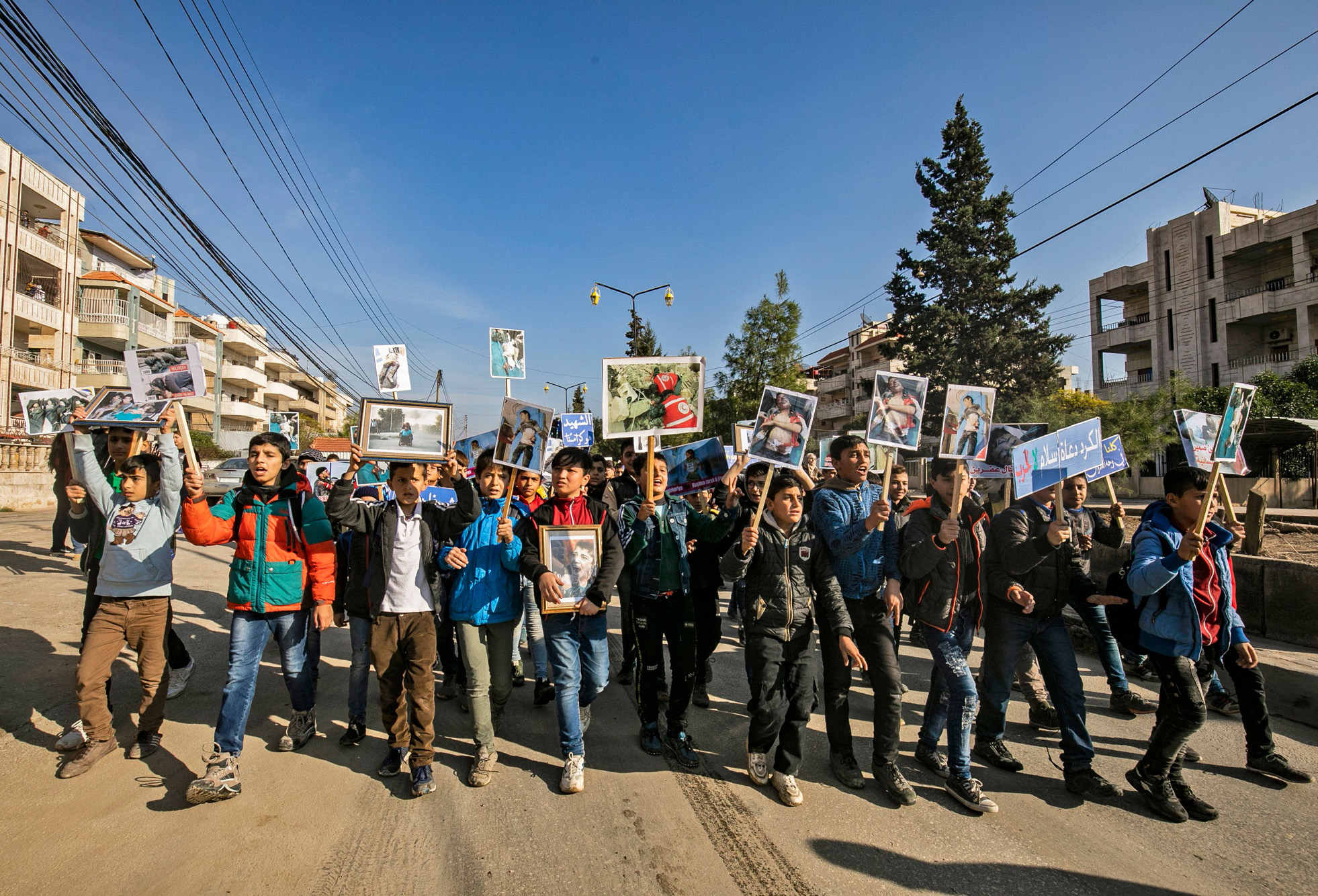 Elementary and secondary school students gathered Wednesday in front of the United Nations offices in Qamishli, northern Syria to protest the killing of nine children in the strategic northwest town of Tel Rafaat two days earlier in Turkish shelling.
