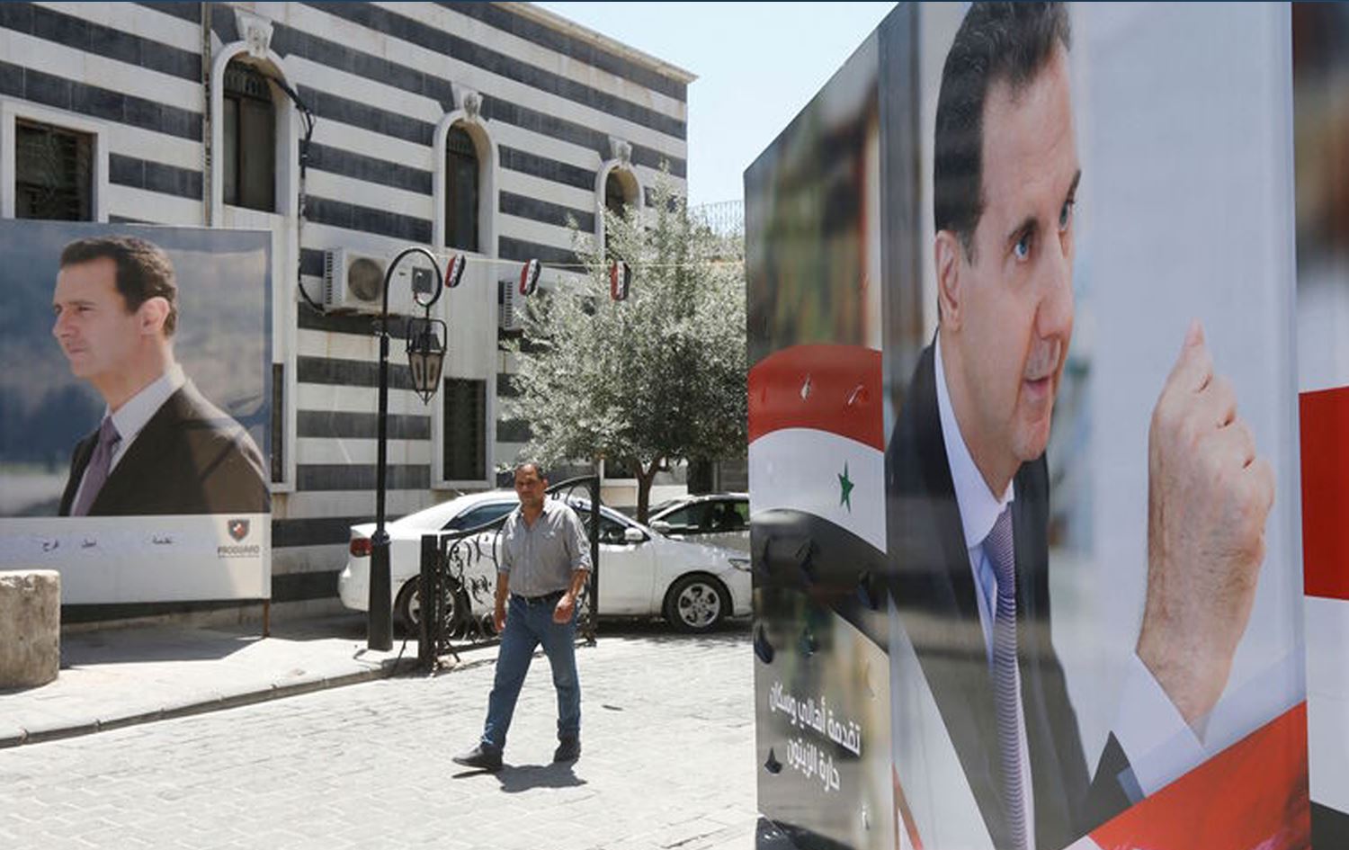 A Syrian man walks walks in between election campaign posters bearing portraits of Syrian President Bashar al-Assad in the capital Damascus on May 18, 2021. Photo: AFP