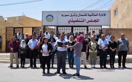 Autonomous Administration of North and East Syria (NES) co-chair Abd Hamid al-Muhashash reads out an August 5 statement outside the Executive Council in Ain Issa, Syria. Photo: ANHA