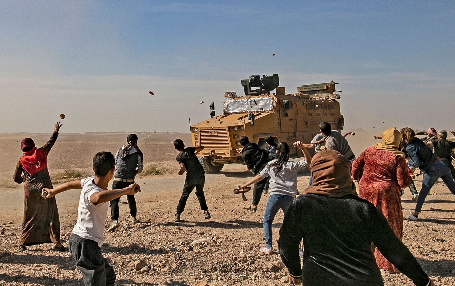 Syrians throw stones at Turkish military vehicles during a Turkish-Russian army patrol near the town of Darbasiyah, November 11, 2019. File photo: Delil Souleiman / AFP