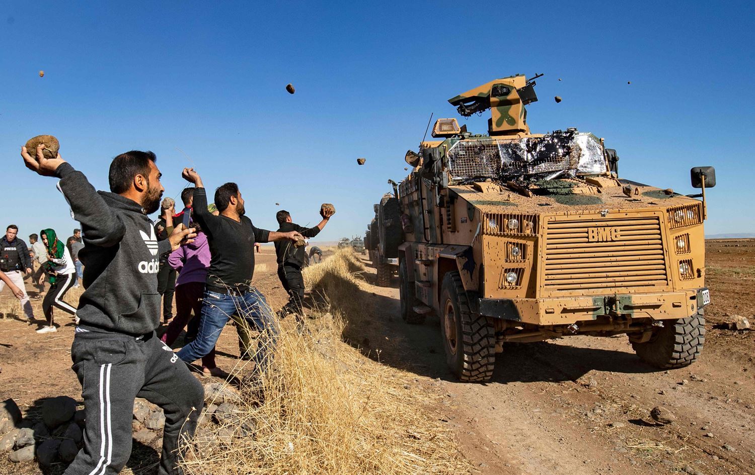 Kurdish demonstrators hurl rocks at a Turkish military vehicle on November 8, 2019, during a joint Turkish-Russian patrol in Hasaka. Photo: Delil/Souleiman/AFP