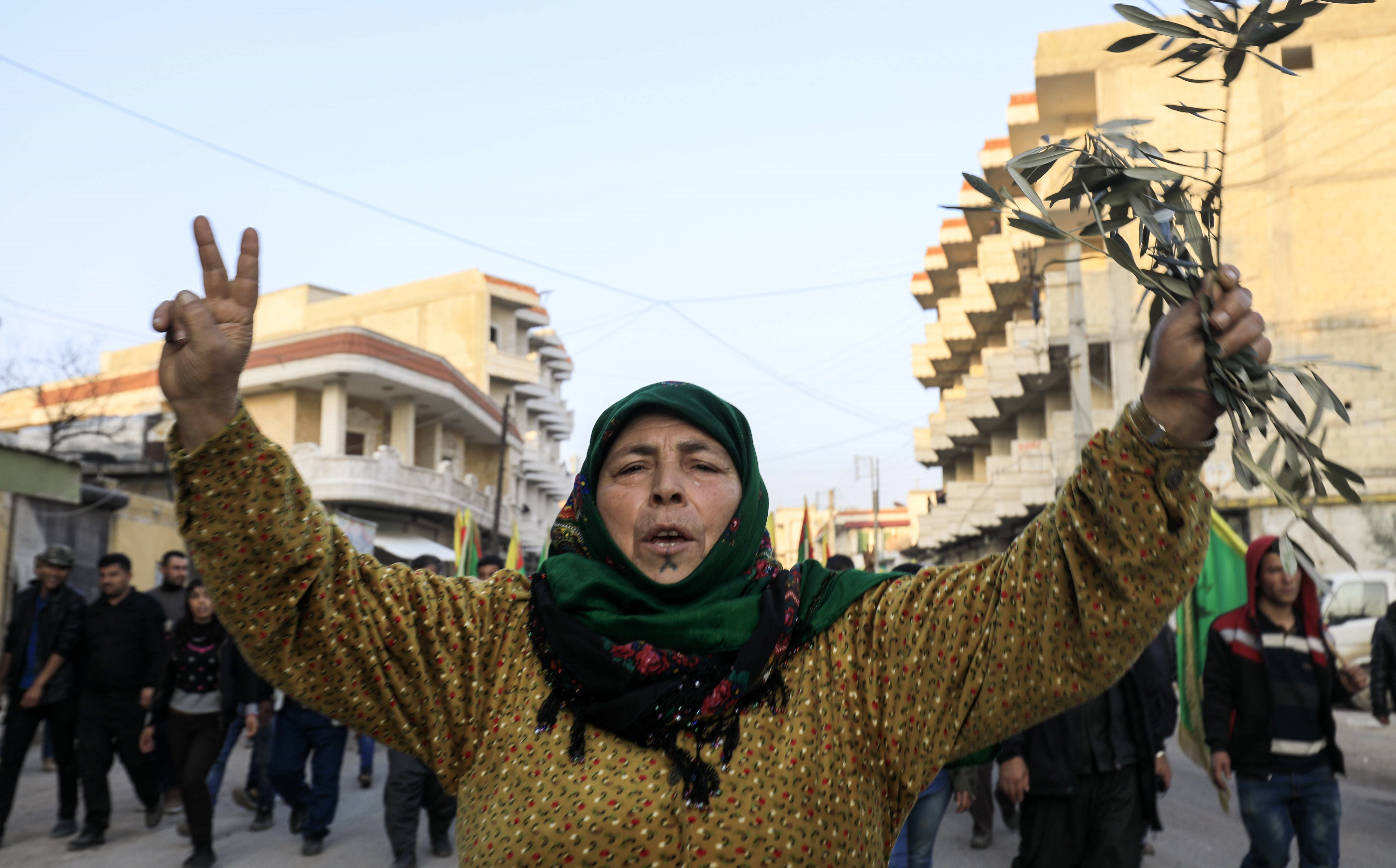 Coming eastern Rojava cities of Hasakah, Qamishli, and Raqqa, they carried olive branches and photos of Kurdish fighters killed in action. They chanted slogans like “We are with you until death, Afrin.”