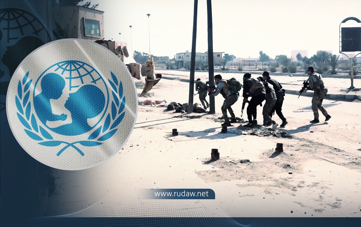 Fighters of the Syrian Democratic Forces (SDF) entering the al-Sina’a prison (right) on January 22, 2022, filmed by Ronhai TV. Photo: Screenshot/Ronhai TV; UNICEF logo (left). Graphic: Rudaw