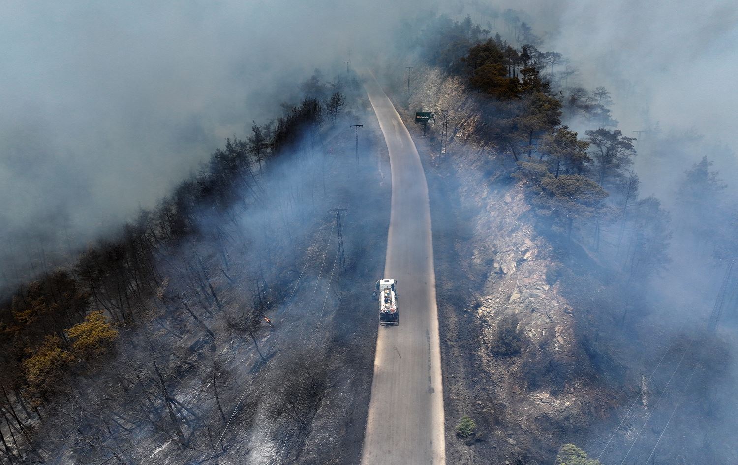 An aerial view shows a fire truck driving down a road as firefighters battle forest fires in the coastal Syrian province of Latakia on July 5, 2025. Photo: Omar Haj Kadour/AFP