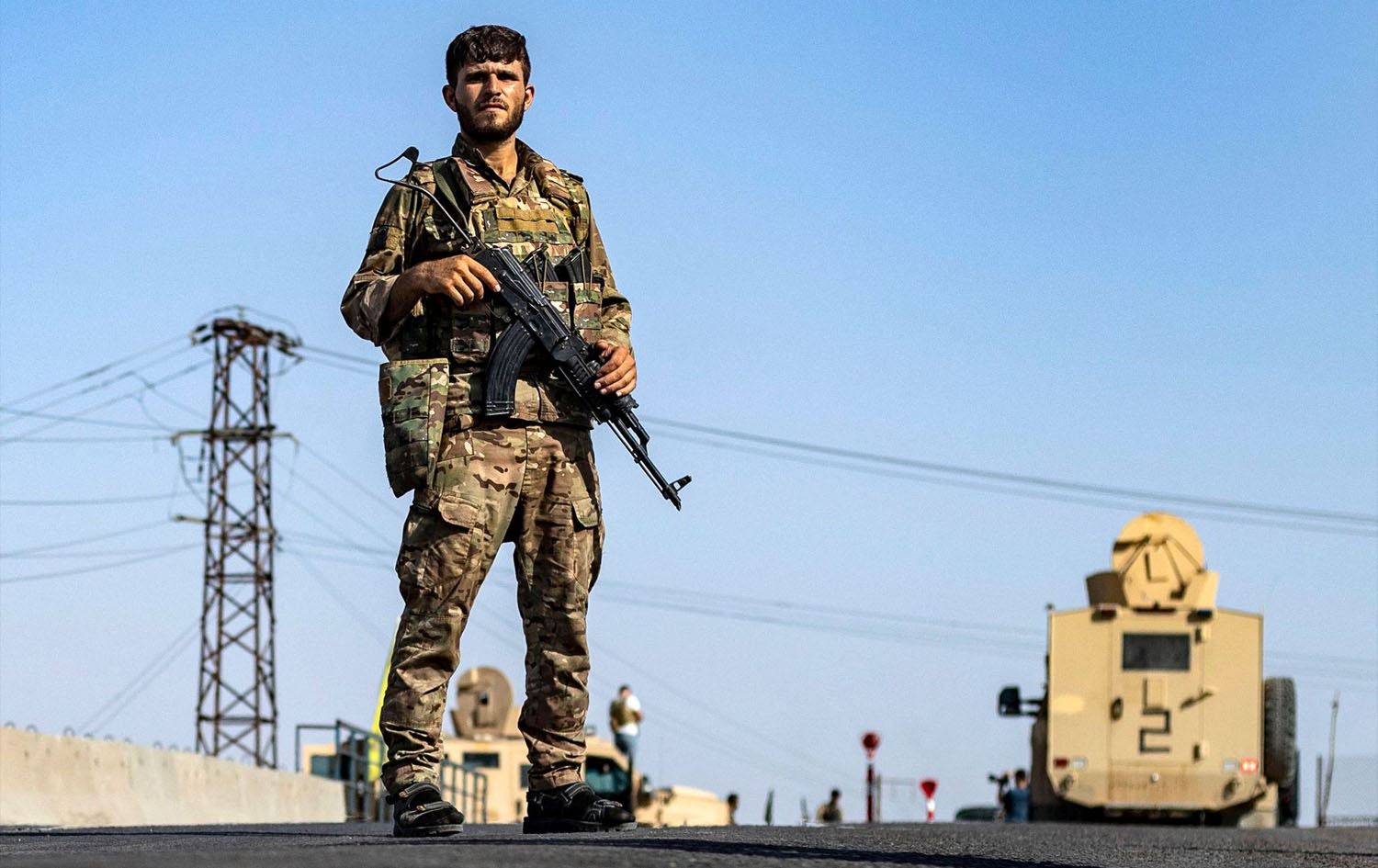 A fighter of the Syrian Democratic Forces (SDF) stands guard along a road as others deploy to impose a curfew in the town of al-Busayrah in Syria's northeastern Deir Ezzor province on September 4, 2023, during a guided media tour organised by the SDF. Photo: Delil Souleiman/AFP