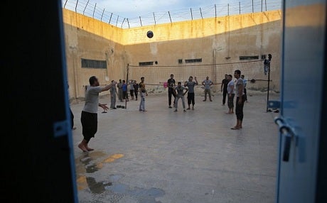 Prisoners play volleyball in a prison housing former ISIS members in Qamishli. Photo: Hussein Malla/AP