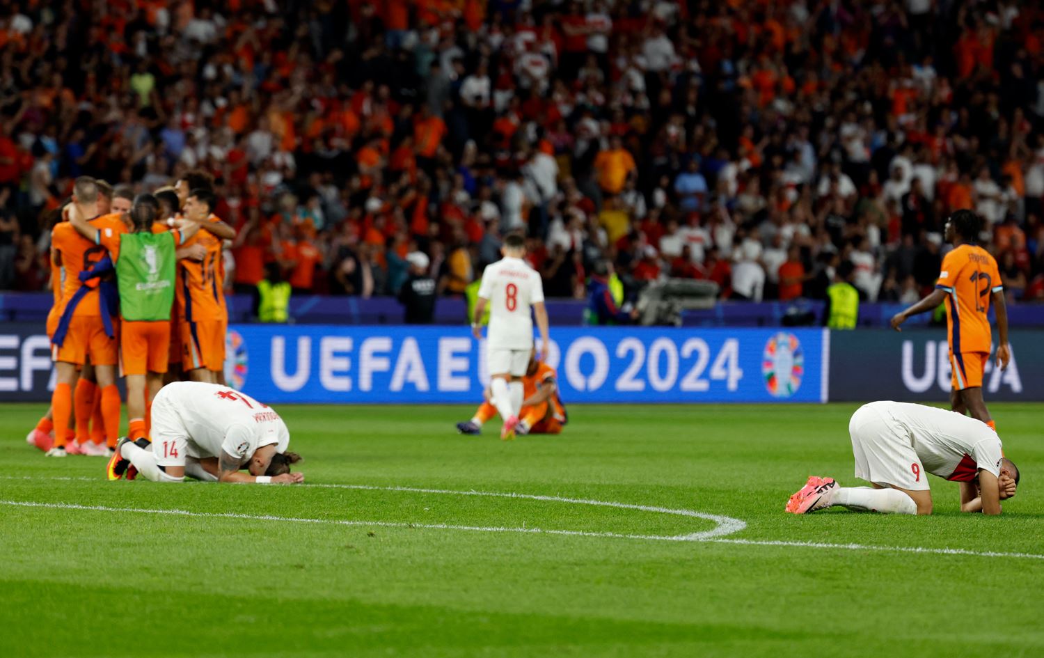 Turkey's players react as Netherlands players celebrate after the UEFA Euro 2024 quarter-final football match between the Netherlands and Turkey at the Olympiastadion in Berlin on July 6, 2024. Photo: Odd Andersen/AFP