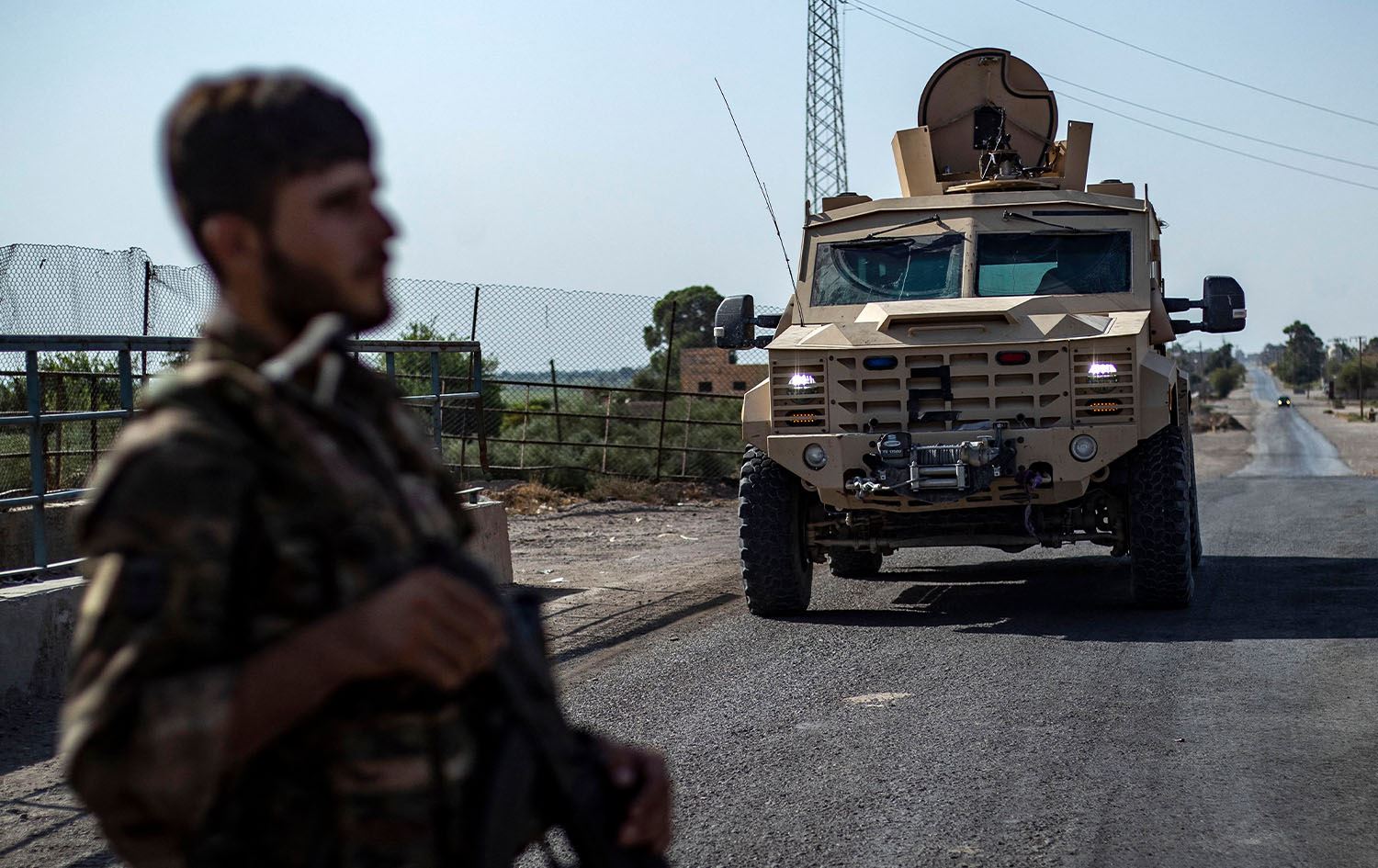 A fighter of the Syrian Democratic Forces (SDF) stands guard along a road as others deploy to impose a curfew in the town of al-Busayrah in Syria's Deir ez-Zor province on September 4, 2023. Photo: Delil Souleiman/AFP