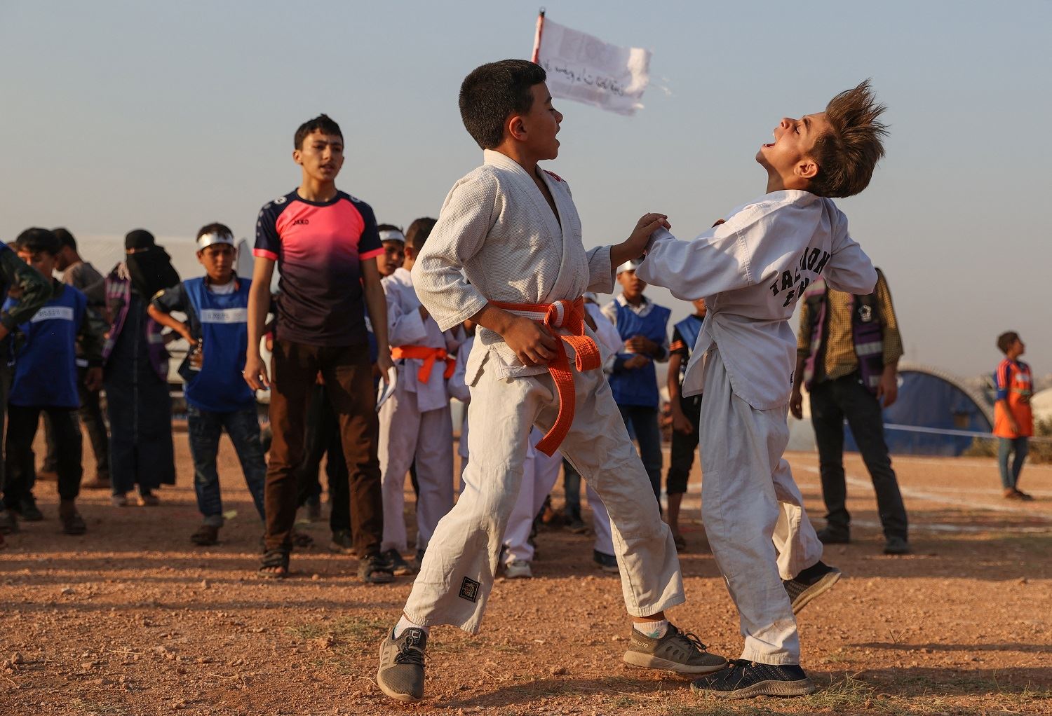Displaced Syrian boys in karate outfits square off against each other, during the so-called "Camp Olympics 2020" in the town of Fuaa, in the northwestern Syrian last major rebel bastion of Idlib, on August 7, 2021. Photo: Omar Haj Kadour/ AFP
