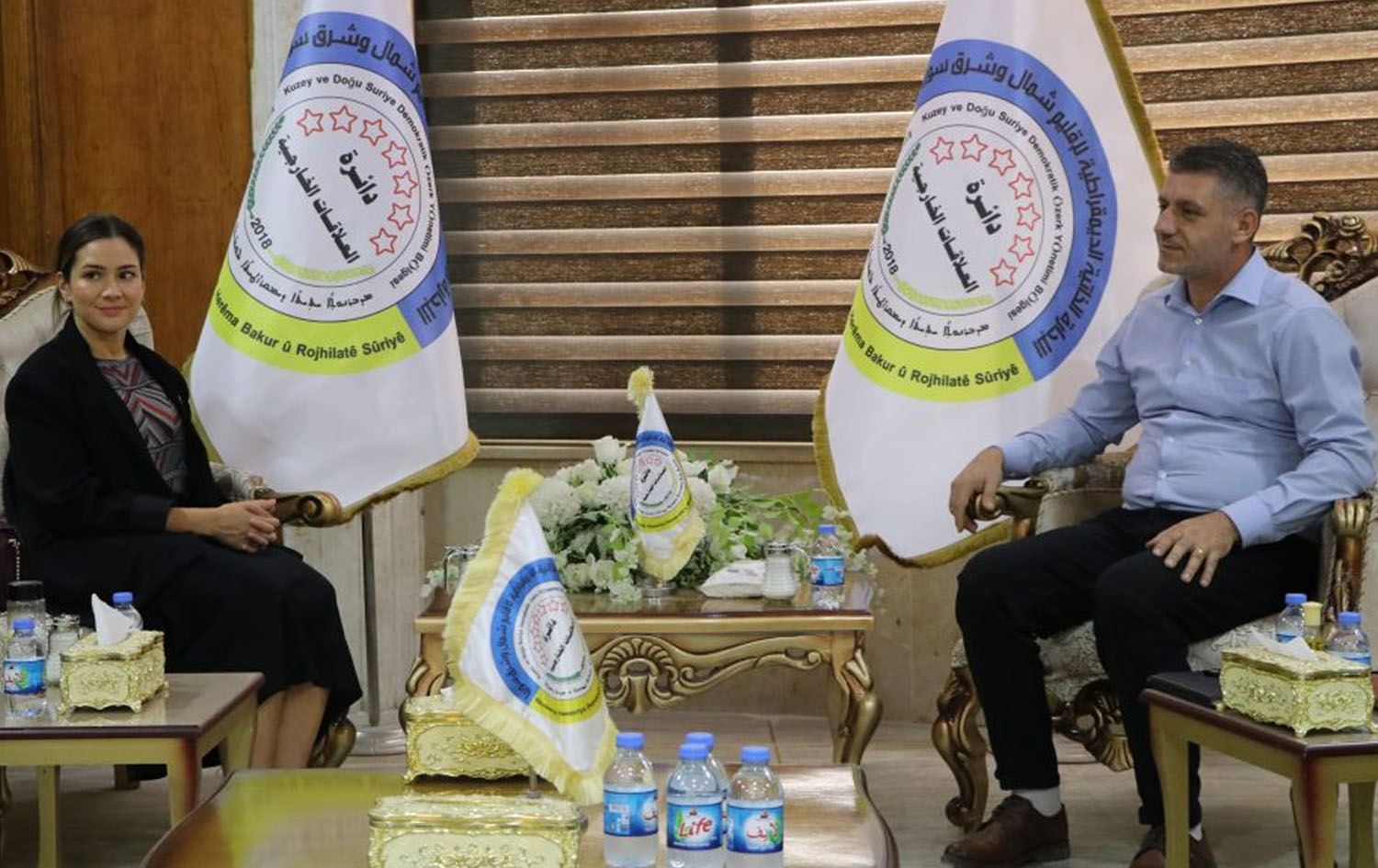 Charlotte Dixon, acting consul general at the British Consulate in Erbil (left) meets Rubel Baho, deputy co-chair of the AANES’ department of foreign relations (right) on August 5, 2025. Photo: AANES