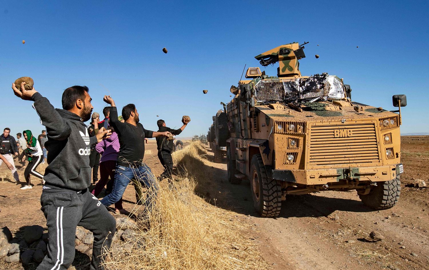 Kurdish demonstrators hurl rocks at a Turkish military vehicle on November 8, 2019, during a joint Turkish-Russian patrol near the town of Al-Muabbadah in the northeastern part of Hasaka on the Syrian border with Turkey. Photo: Delil Souleiman/AFP