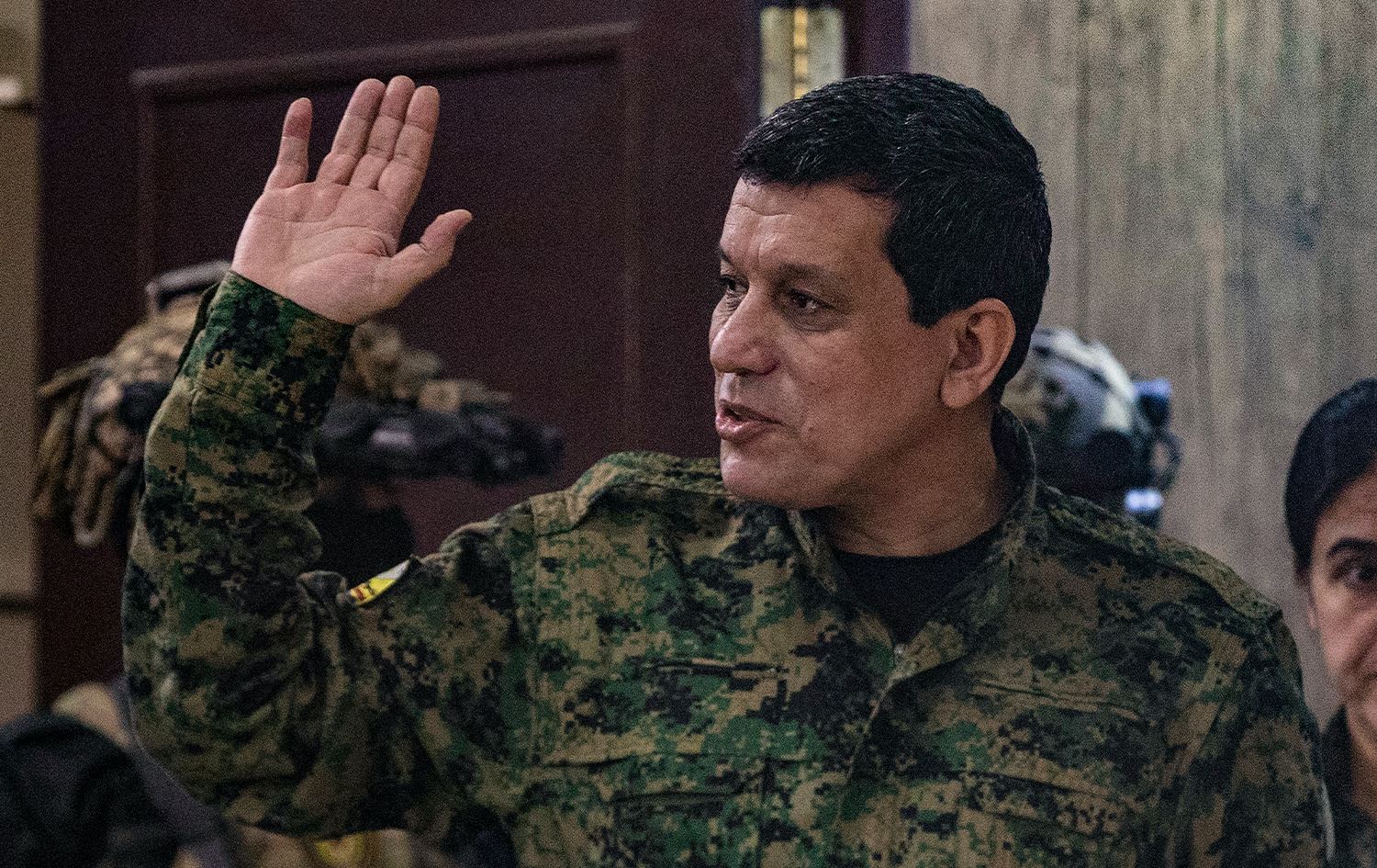 Syrian Democratic Forces (SDF) commander-in-chief Mazloum Abdi, waves after giving a press conference in Syria's northeastern city of Hasaka on December 6, 2024.