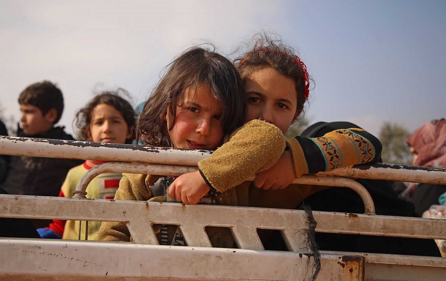 Displaced Syrian girls stand in the back of a truck parked at a newly-established camp on the edges of Maaret Misrin town in Syria's Idlib province, February 6, 2020. Photo: Aaref Watad / AFP