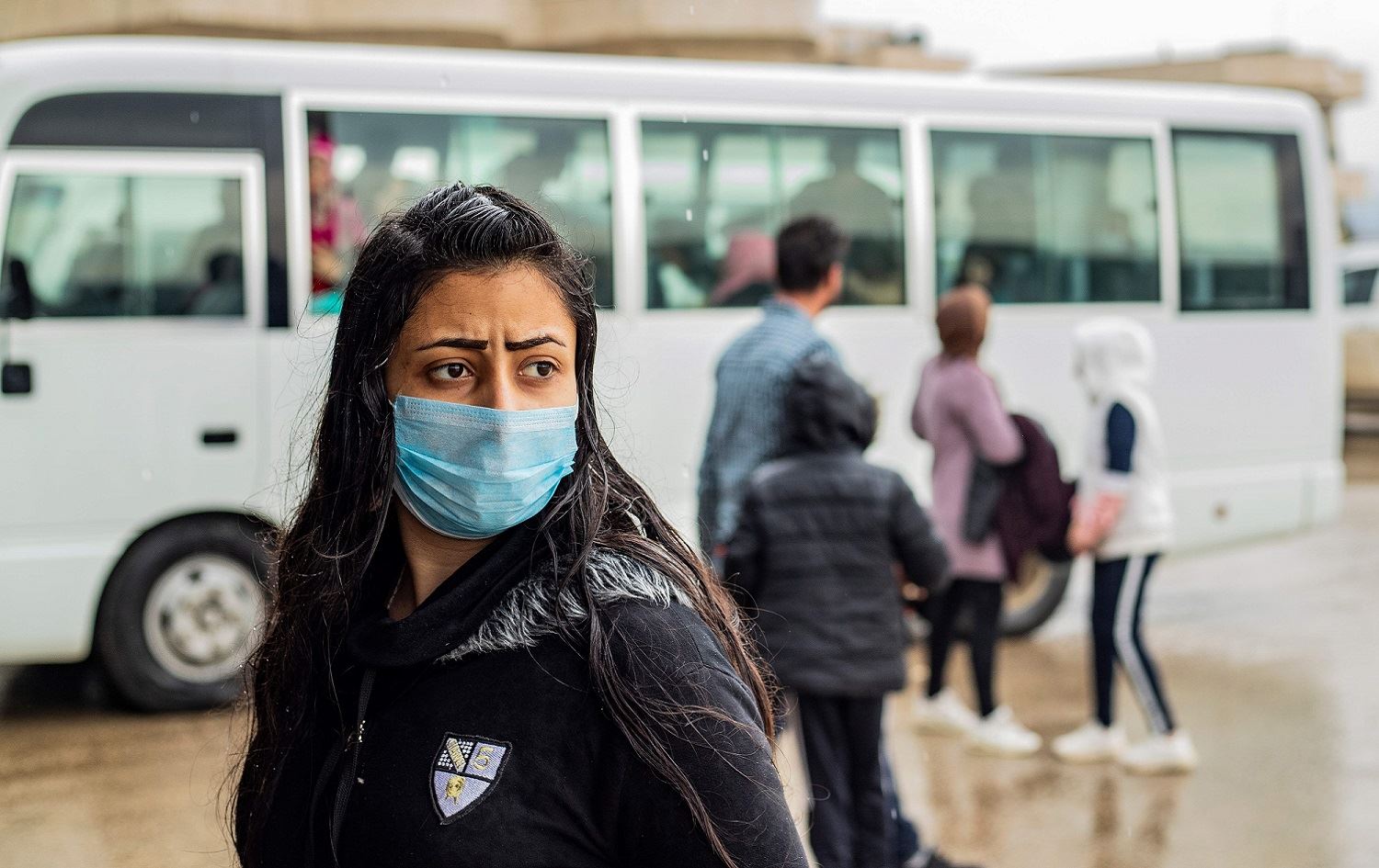 A mask-clad passenger looks on upon her arrival by bus in Syria’s Kurdish area from Iraqi Kurdistan via the Semalka border crossing in northeastern Syria, March 1, 2020. Photo: Delil Souleiman / AFP