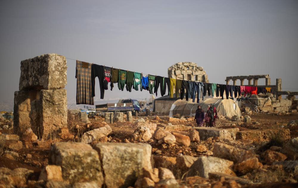 Syrian displaced people walk next to ancient Roman ruins in Sarmada district, north of Idlib city, Syria on November 25, 2021. Photo: Francisco Seco/AP